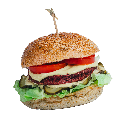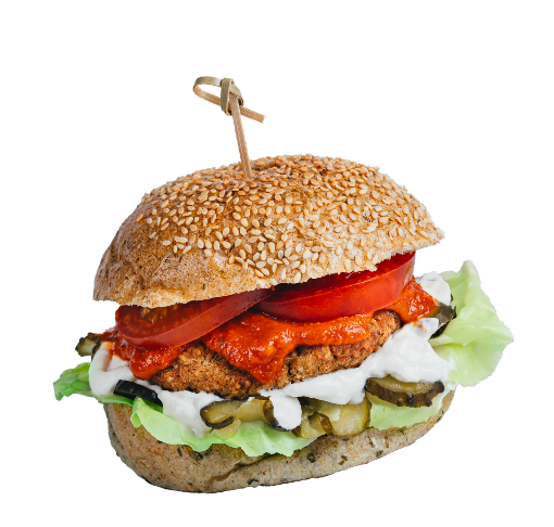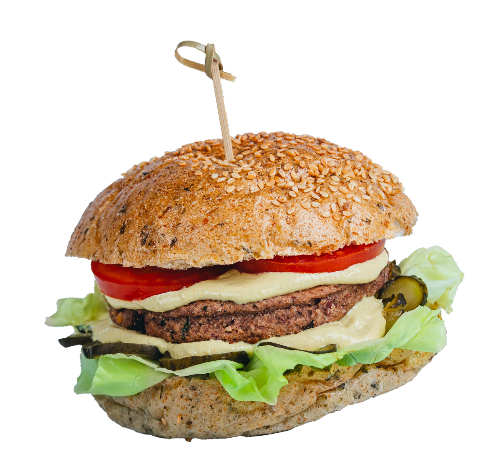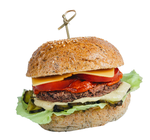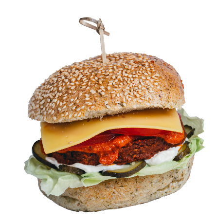 Chiftea Vegană Cheeseburger (ciuperci, nucă, năut, fasole roșie, pătrunjel, fulgi de ovăz, semințe de floarea soarelui, condimente), roșii, castraveți murați în saramură, salată verde, sos barbeque (roșii pasate, condimente), cheddar vegan, chiflă cu spanac și spirulină, 330 g