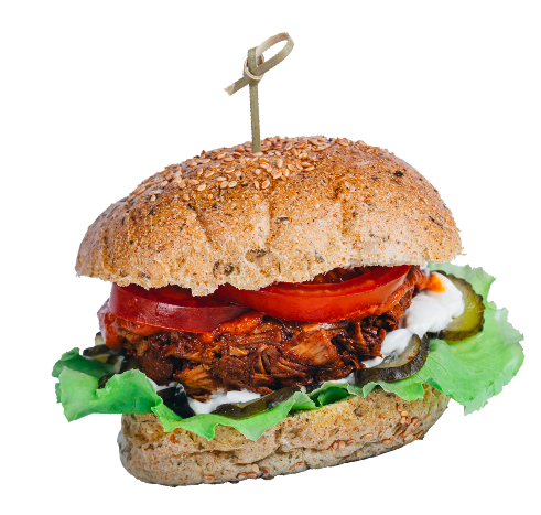 Pulled jackfruit (Jackfruit marinat (din conservă bio), soia, ceapă, sos de soia, unt de arahide, ulei de susan), castraveți murați, sos barbeque, sos de usturoi, salată verde, chiflă cu spanac și spirulină, 330 g
